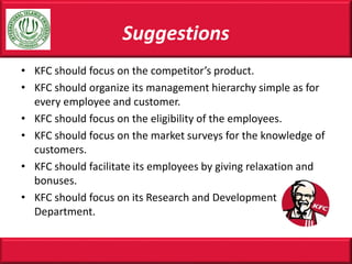 Content Company Introduction SWOT Analysis for KFC India PESTEL Analysis Political Cultural Economic Regulatory and Ecological Issues Recommendations and solutions KFC. The analysis disclosed that KFCs main strengths are its brand name and good reputation coupled with franchising and distribution strategies. The recommendations are given below.